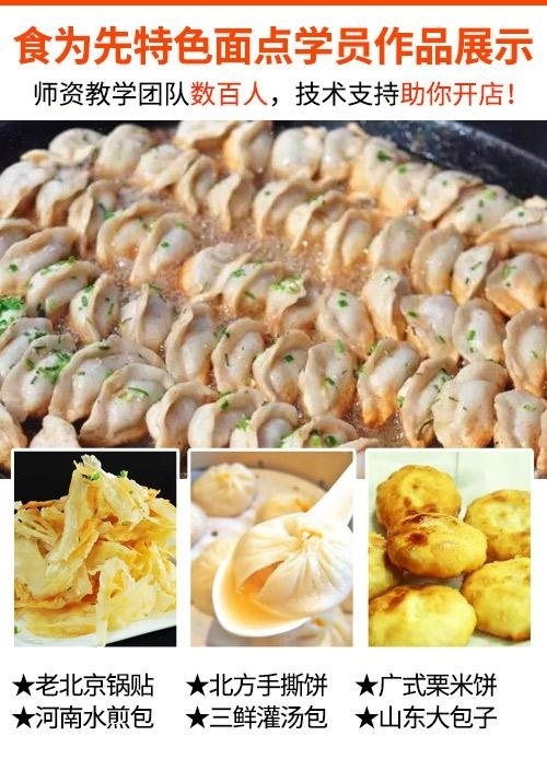 特色面点高级班学习内容:上海三鲜灌汤包、河南水煎包、北方手撕饼、北京锅贴、粟米饼、芝麻酱饼